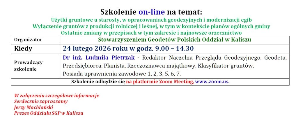 Ośrodek Szkolenia Geodetów i Kartografów Stowarzyszenia Geodetów Polskich oraz Stowarzyszenie Geodetów Polskich Oddział w Kaliszu zapraszają na szkolenie: